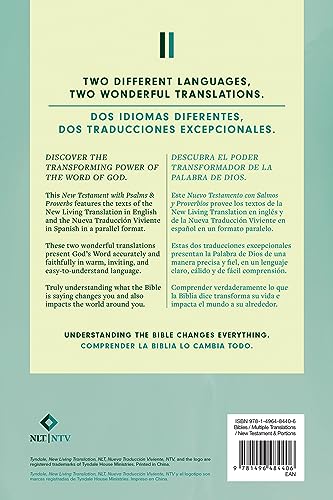 ¡Una Biblia perfecta para los que están descubriendo la Palabra de Dios en dos idiomas!El Nuevo Testamento con Salmos y Proverbios bilingüe NTV/NLT [Bilingual New Testament with Psalms & proverbs NLT/NTV] tiene los textos del Nuevo Testamento con Salmos y Proverbios de la Nueva Traducción Viviente en español y de la New Living Translation en inglés en un formato paralelo.Sus características incluye: Tapa rústica de diseño único Barniz UV (Spot-gloss) en la portada Medidas: 5.5 x 8.25 Tamaño ligero y fácil de llevar Esta porción de la Biblia presenta la Palabra de Dios en un lenguaje claro, cálido, y de fácil comprensión para una buena experiencia de nuestras dos increíbles traducciones.A perfect Bible for those who are discovering God´s Word in two languages!The Bilingual New Testament with Psalms & Proverbs NLT/NTV [Nuevo Testamento con Salmos y Proverbios bilingüe NTV/NLT] provides the New Testament texts along with Psalms and Proverbs of the New Living Translation in English and the Nueva Traducción Viviente in Spanish in a parallel format.Its features include: Unique softcover design Spot-gloss on the cover 5.5 x 8.25 trim size Lightweight and easy to carry size This Bible portion presents God’s Word in a warm and easy to understand language, providing a great reading experience of our two wonderful translations side by side.