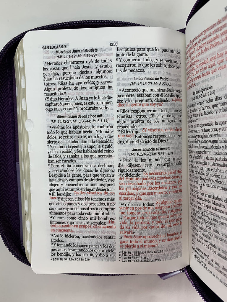 Reina Valera 1960, tamaño bolsillo (100x140 mm), I/piel lila/lila con índice y cierre, canto plateado palabras de Jesús en rojo. Concordancia amplia de palabras de la Biblia, concordancia personajes. 32 páginas a todo color con ayudas y esquemas. 12 mapas a todo color .Referencias cruzadas. Letra: 8,5 puntos.