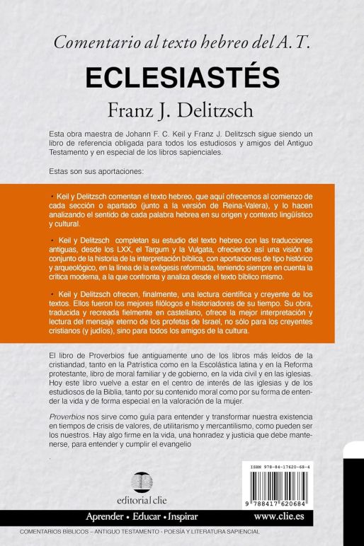 Adquiere la nueva adición de la aclamada serie del Comentario al texto hebreo del Antiguo Testamento de Franz Julius Delitzsch sobre el libro de Eclesiastés ahora disponible por primera vez en español. Considerado el comentario por excelencia entre todos los comentarios del Antiguo Testamento y citado constantemente por otros comentaristas, lingüistas y estudiosos de la Biblia, el Biblischer Commentar über das Alte Testament es un trabajo magistral de investigación filológica realizado por Johann Friedrich Carl Keil y Franz Julius Delitzsch, reconocido universalmente como la obra más completa, seria y erudita que se ha escrito sobre el Antiguo Testamento. Constituye la mejor forma de aproximación a la complejidad del sentido original de las palabras utilizadas en el texto hebreo. Su virtud principal consiste en llevar a cabo un profundo análisis filológico de cada palabra importante en cada texto notable del Antiguo Testamento, dentro de su contexto, y de una manera asequible para quienes no dominan o incluso no tienen conocimiento alguno del hebreo. para ello, Keil y Delitzsch basan su exégesis en una traducción directa del hebreo de cada pasaje a comentar, buscando luego su apoyo textual en las traducciones antiguas, como la Septuaginta y la Vulgata. Luego, analizan ese texto a la luz del uso y sentido dado a esa palabra hebrea en otros pasajes de la Biblia. Después, incluyen en sus investigaciones los descubrimientos al respecto en áreas documentales científicas cercanas a la exégesis del Antiguo Testamento, como la historia y la arqueología. Y completan su comentario presentando la interpretación que de ese texto o palabra hicieron los Padres de la Iglesia y los Reformadores. "