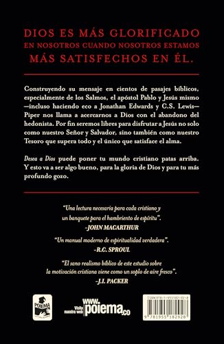 DIOS ES MÁS GLORIFICADO EN NOSOTROS CUANDO NOSOTROS ESTAMOS MÁS SATISFECHOS EN ÉL.Construyendo su mensaje en cientos de pasajes bíblicos, especialmente de los Salmos, el apóstol Pablo y Jesús mismo -incluso haciendo eco a Jonathan Edwards y C.S. Lewis Piper nos llama a acercarnos a Dios con el abandono del hedonista. Por fin seremos libres para disfrutar a Jesús no solo como nuestro Señor y Salvador, sino también como nuestro Tesoro que supera todo y el único que satisface el alma.Desea a Dios puede poner tu mundo cristiano patas arriba. Y esto va a ser algo bueno, para la gloria de Dios y para tu más profundo gozo.