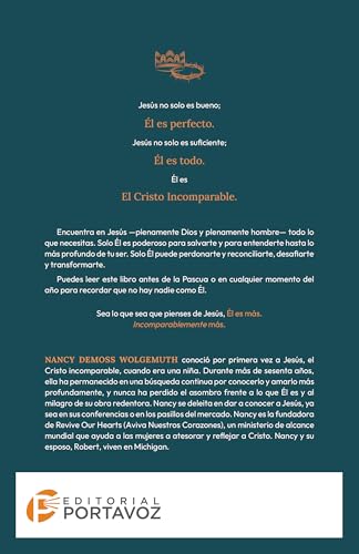 En un recorrido de cincuenta días, inspirado en el volumen clásico de J. Oswald Sanders, El Cristo incomparable, el lector será guiado por la sobresaliente autora y maestra bíblica Nancy DeMoss Wolgemuth, a explorar la singularidad de la vida, el impacto y las enseñanzas del Señor Jesús. Desde el cielo hasta la tierra. De su nacimiento hasta su muerte. Desde la resurrección hasta este mismo instante. Desde antes de los tiempos hasta toda la eternidad.