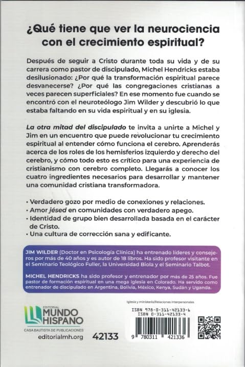 Comunidad cristiana, neurociencia y superación del estancamiento espiritual ¿Qué tiene que ver la neurociencia con el crecimiento espiritual? ¿Por qué la transformación espiritual parece desvanecerse? ¿Por qué las congregaciones cristianas a veces parecen superficiales? La otra mitad del discipulado te invita a unirte a Michel y Jim en un encuentro que puede revolucionar tu crecimiento espiritual al entender cómo funciona el cerebro. Aprenderás acerca de los roles de los hemisferios izquierdo y derecho del cerebro, y cómo todo esto es crítico para una experiencia de cristianismo con cerebro completo. Llegarás a conocer los cuatro ingredientes necesarios para desarrollar y mantener una comunidad cristiana transformadora. Verdadero gozo por medio de conexiones y relaciones Amor jésed en comunidades con verdadero apego. Identidad de grupo bien desarrollada basada en el carácter de Cristo. Una cultura de corrección sana y edificante.